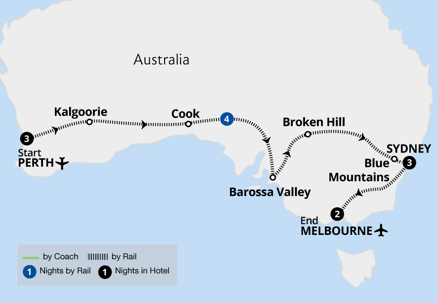 Take the journey of a lifetime on the Indian Pacific rail route from Perth to Sydney. See Australia in a unique way, aboard this plush and stylish train, experiencing the country's landscape from a privileged perspective. Then spend some time in Sydney, the iconic harbour city, where you can experience the famous beaches, the opera house, and...