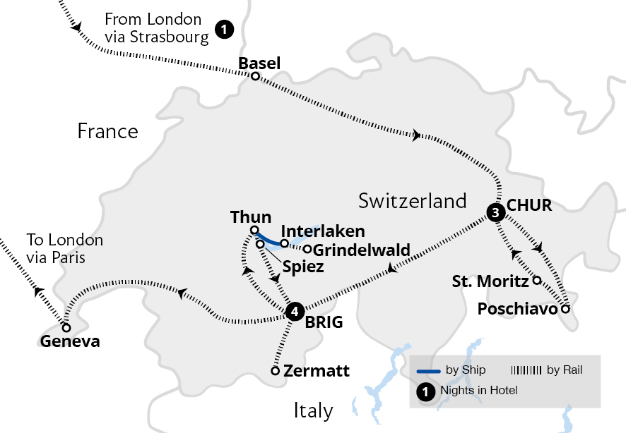 Experience epic mountain landscapes and shimmering alpine lakes on this fantastic holiday to Switzerland. Discover the Swiss Alps on the world-acclaimed Bernina Express and Glacier Express from our popular bases in Chur and Brig, traditional towns surrounded by snow-capped peaks. Enjoy a private aperitif on the terrace of the 10th-century ...