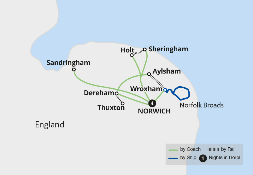 Discover timeless seaside towns, experience wonderful wildlife, and explore Sandringham - one of the best-loved stately homes of the British Royal Family - on this holiday to Norfolk. From our elegant boutique hotel, restored from a Victorian townhouse in a quiet conservation area in Norwich, we delve into this scenic region. Sail along the...