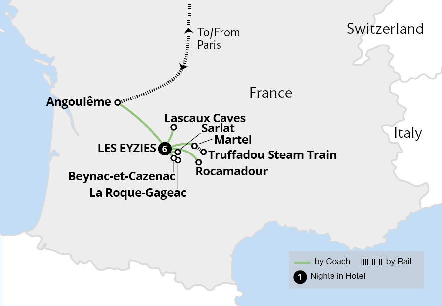 In the French capital, we are transferred across the city to Gare Montparnasse, where we catch the high-speed TGV and journey in First Class to Angoulême. From here, we continue by coach to Les Eyzies, our base for the next six nights. The Dordogne is known as the jewel of French gastronomy and, with truffles and walnut trees dotting this verdant land of thick forests we pass, it's little wonder.